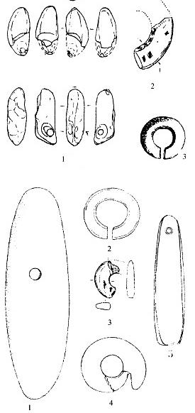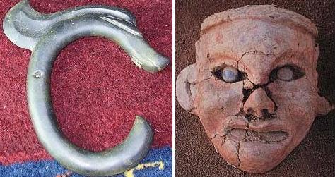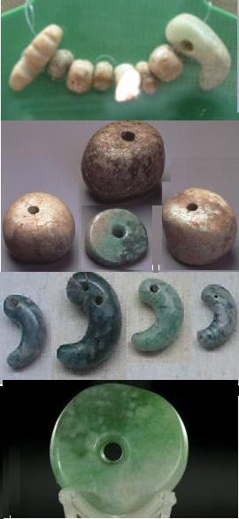 (Left) are similar to or simpler than the jade objects found in Xinglongwa and other sites of NE China and eastern Siberia; since these are earlier and more primitive than Hongshan jade, the inevitable idea arising is that early Jomom people started fashioning the smooth and colourful pebbles they found in Hokkaido and other parts of Japan into personal ornaments and brought the techniques to China, with those that settled in the Hongshan area developing particularly superior skills in this art, in addition to obtaining the concept of dragon and other shamanistic ideas from tribes that came from the west, while those back in Japan made much less progross, as shown on the right with a set of jade objects close in time to Hongshan or later; in any case, Chinese readers might be mollified by the knowledge that after Jomon culture came the Yanoi culture, with rice cultivation and bronze, clearly from China.