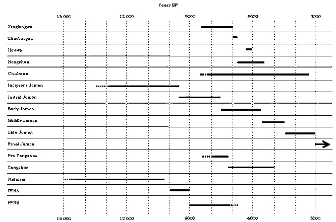 Chart Above shows the time periods of some neolithic cultures in comparison to Hongshan (PPN means pre-pottery neolithic - a Eurocentric concept since in Japan pottery appeared already; PPN A and B periods differ in domestication of animals; Jumon/Chulman are Japanese/Korean neolithic cultures, Natufian is a middle east one; Houwa neighbours Hongshan)