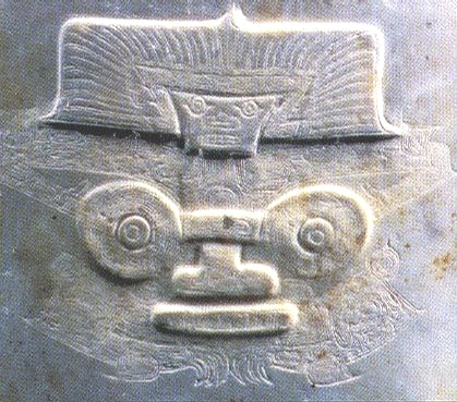 which appears on the ritual cong 琮 object and jade axes frequently; it probably represents the legendary demon Xingtian 刑天 who, after his head was chopped off by Yellow Emperor, used his breasts as eyes and navel as mouth, to continue fighting, till he was killed a second time. This motif passed into Longshan and Xia culture, e.g., the Erlitou turquoise mosaic appears to be a variation of the two faces design